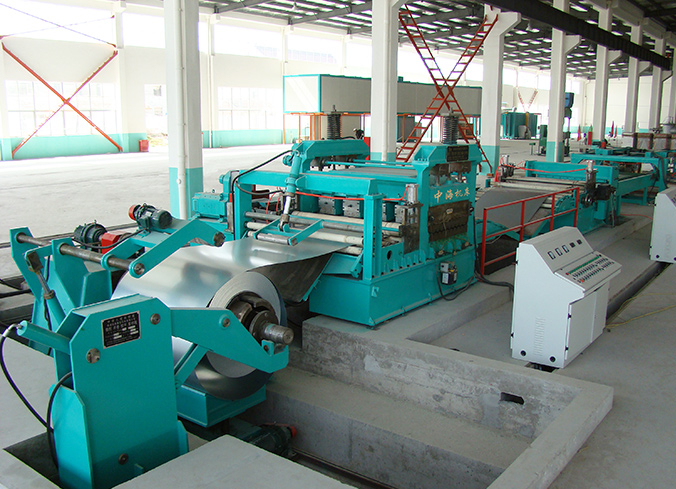 該生產(chǎn)線是將較薄金屬卷板整平、剪切成塊狀板材的專用設(shè)備。通常由上料小車、開卷機、托板壓引裝置、校平主機、活動過橋、導(dǎo)向糾偏裝置、定尺機構(gòu)、覆膜裝置、剪板機、輸送工作臺、氣動排料架、液壓升降垛料臺、運料滾道臺及液壓系統(tǒng)、電氣控制系統(tǒng)等組成,協(xié)同動作PLC控制。